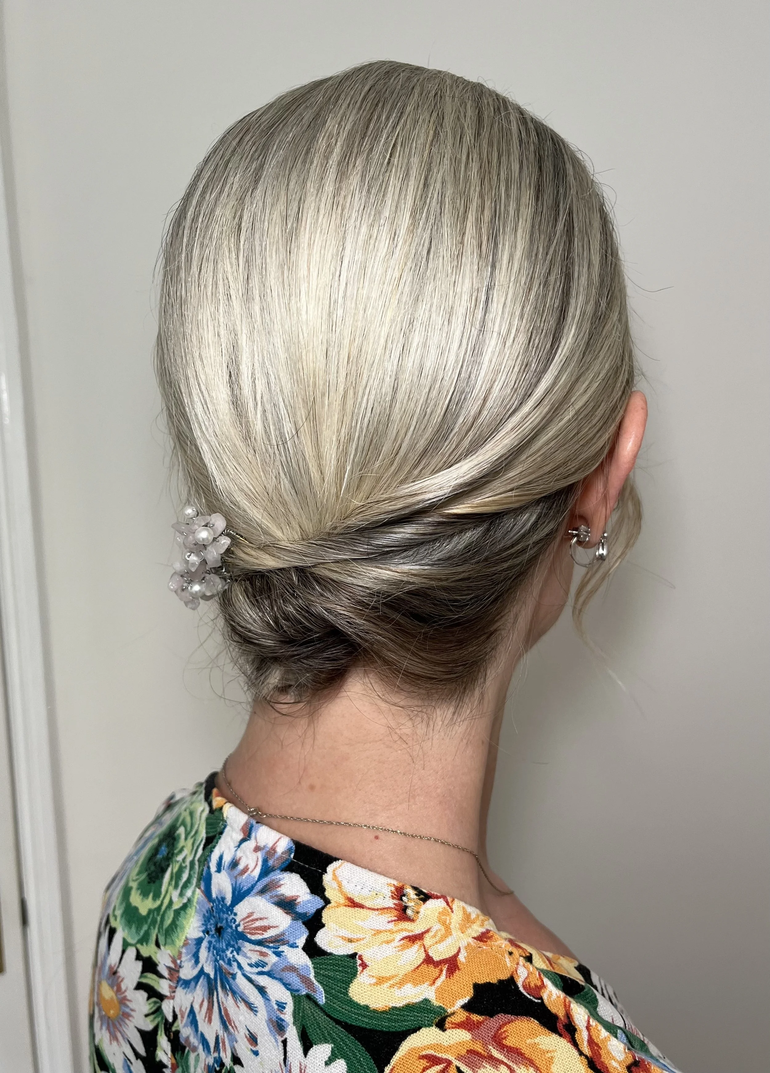 Here’s an example of a sleek updo I created on my Mum - she doesn’t have long enough hair to get a proper bun, but if your fine hair is longer, a slicked back bun is 100% an option for you. Watch how I created it on Instagram or Tiktok.