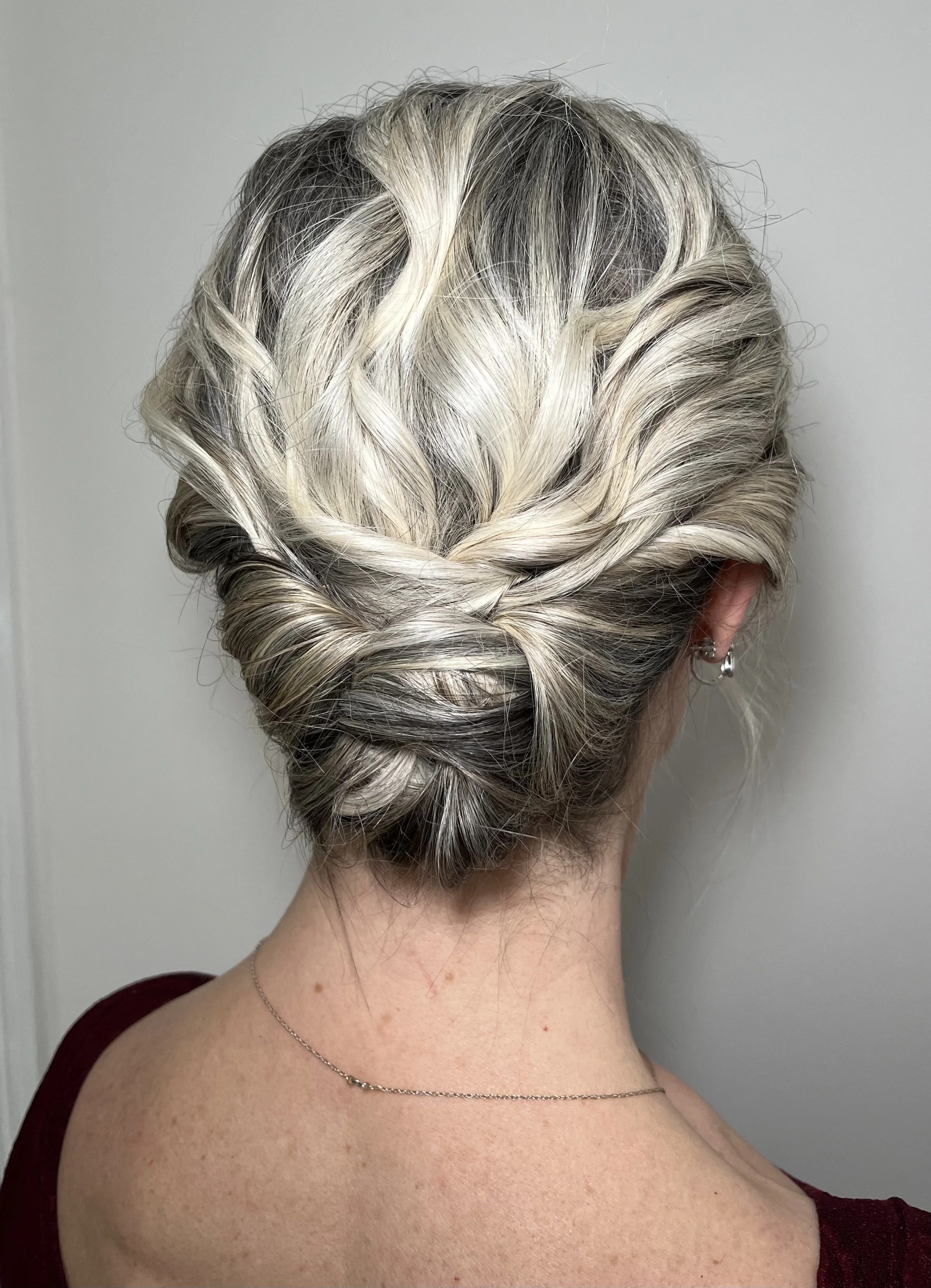 This updo was created on mid length, fine hair. Watch how I created it on Instagram or Tiktok.
